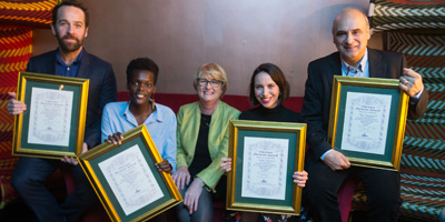 The Clarence Derwent Award winners with Christine Payne , centre. From Right to left JonJo O’Neill, Sheila Atim, Christine and Kate O’Flynn. Photo by Mark ThomasThe judges were Richard Digby Day, Thelma Holt, Kate Bassett, Matt Trueman Susannah Clapp and Equity President Malcolm Sinclair and Jonathan Munby.